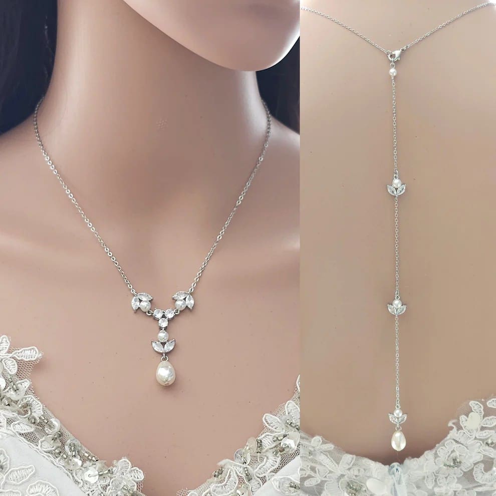 This versatile design allows brides to personalize their look. They can wear the front necklace alone for a simple touch or add the detachable back piece for a more dramatic effect. The adjustable length (16″, 18″, and 20″) ensures a perfect fit, while the silver, gold, or rose gold plating options complement a variety of wedding dress styles.   Detachable back necklace drop measures 8-1/2 inches.
