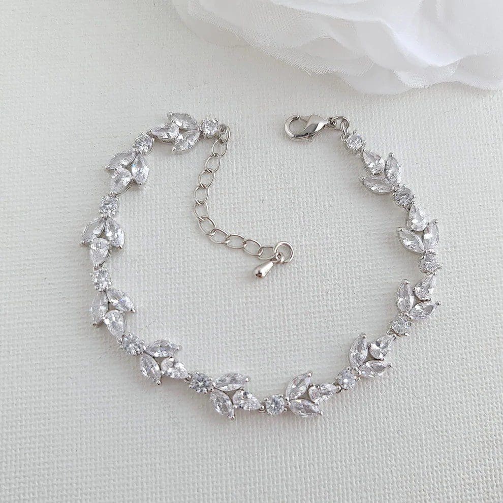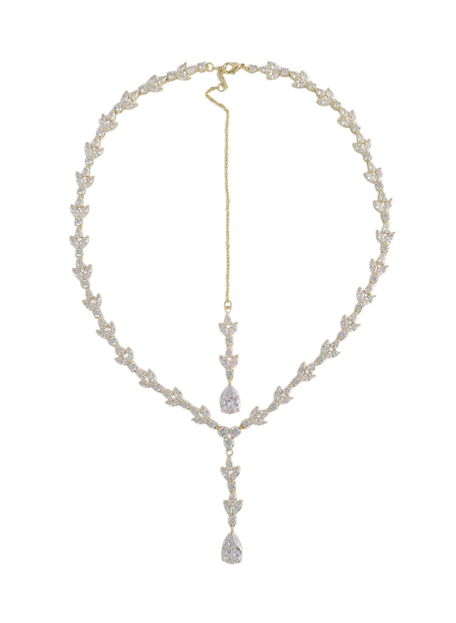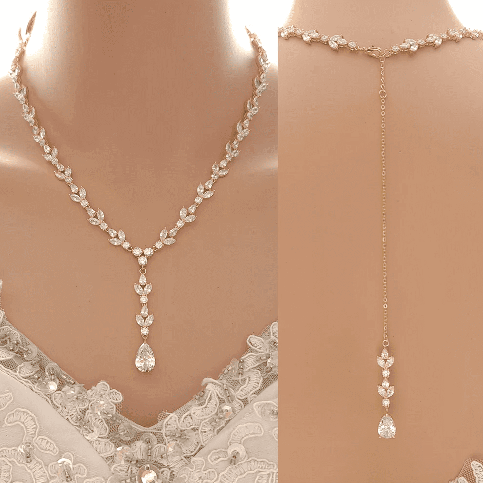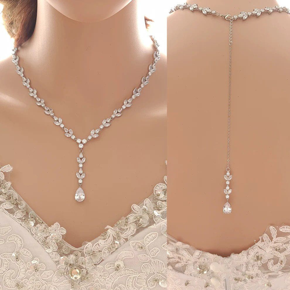 This timeless set is crafted with high-quality, sparkling cubic zirconia stones put together in a tulip-like pattern.  The CZ’s are sure to catch the light and add a touch of glamour to any bride’s look.  The set includes a necklace, bracelet and earrings —  each may be purchased separately.  The necklace has a detachable backdrop, adding a touch of extra elegance for backless or open wedding dresses or other special occasion dresswear.  Because necklace has a detachable backdrop, you get TWO NECKLACES IN ONE!!
