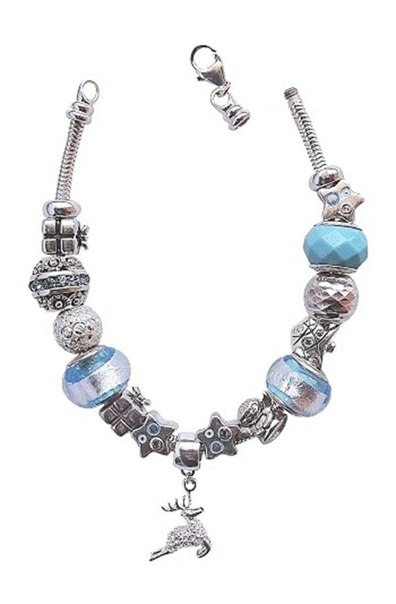 Feel the spirit of the season with this gorgeous Blue Christmas charm bracelet, featuring blue topaz cubic zirconia gemstones, glass beads and much more. The polished silver bracelet secures simply with a lobster claw clasp. End caps on this rhodium-plated bracelet unscrew so beads may be removed. Length: 7 inches Beads are compatible with other large-hole bead bracelets. Item No.: XM15001