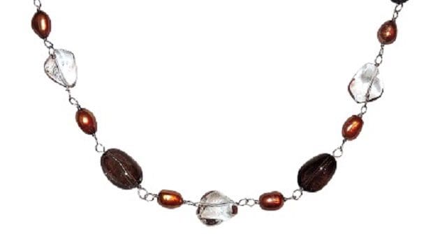 Accessorize with a string of pearls featuring clear and copper colors on silver links. This highly polished necklace dresses up casual and formal wear.   Necklace has a toggle clasp.  Sterling silver links are strung with 11 pcs. cultured, freshwater copper-dyed pearls (6.0mm); 6 pcs. brown quartz (12.0mm); 5 pcs. clear quartz (12.0mm).   Length:  17”    Item No.: FALL1602QP or QTZ001