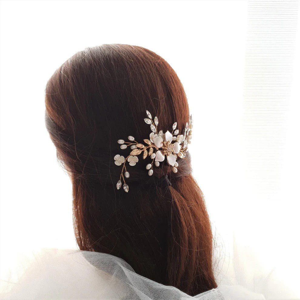 This beautiful haircomb has a large detailed gold flower in the center, with a delicate wire, twisted crystal leaves, and pearl leaves, and tiny white flowers to compliment the hair comb AND your wedding day look.