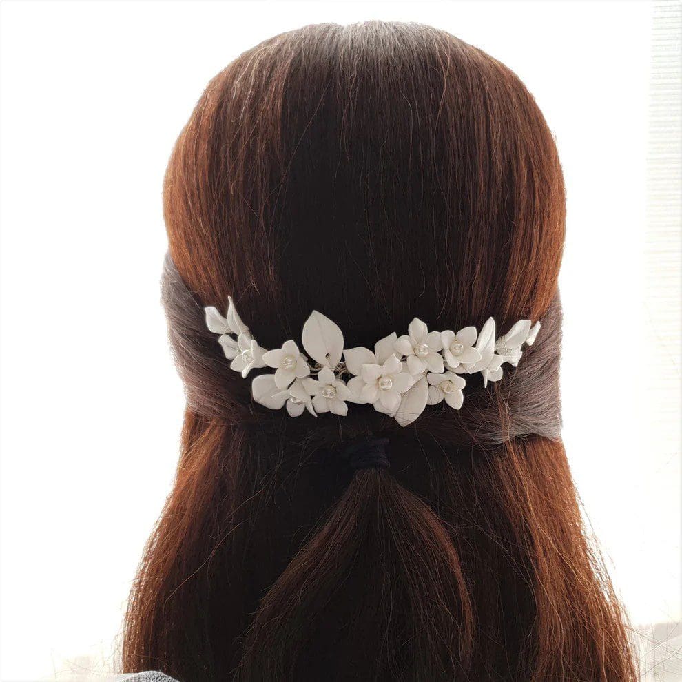 White Flowers with the added touch of a pearl evoke timeless beauty and elegance to this hair comb. Flowers are wire wrapped in gold wire. The combination of small and big flowers give the comb added dimension. The flowers and leaves are made with white porcelain.